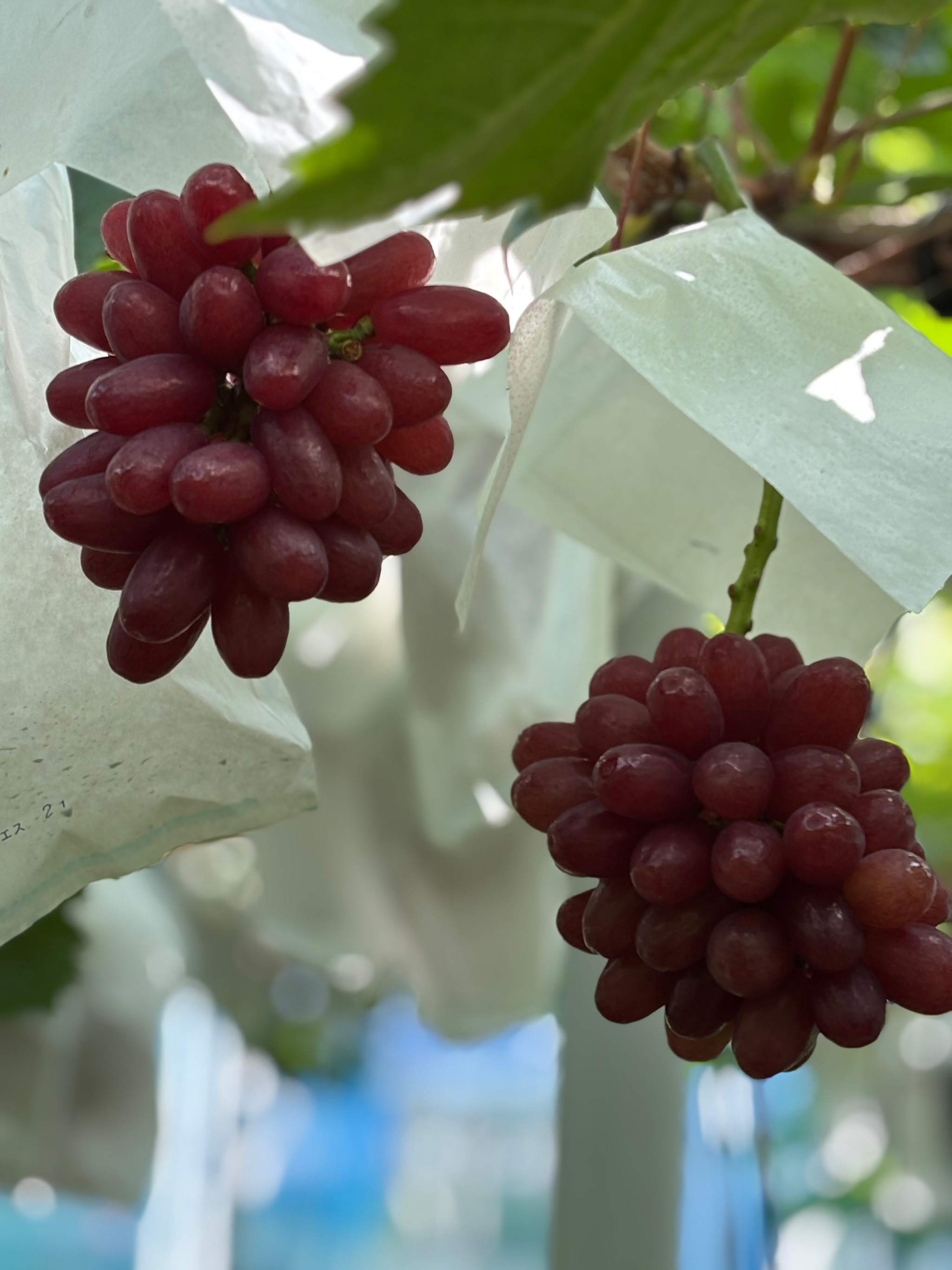我が道というぶどうになります。シャインの子供で赤いぶどうになります。房売りがなかなかできないので、
